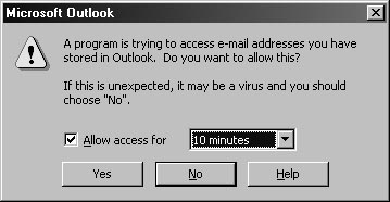 Another seemingly undocumented security enhancement I discovered: If Outlook isn't already running when your application attempts to connect, the CreateOLEObject() method will simply fail and an instance of Outlook won't be created. On a system without all of the new security patches, however, an instance of Outlook was created even when Outlook wasn't already running. So a little extra exception handling will probably be necessary to keep your users out of the dark when your application can't connect.